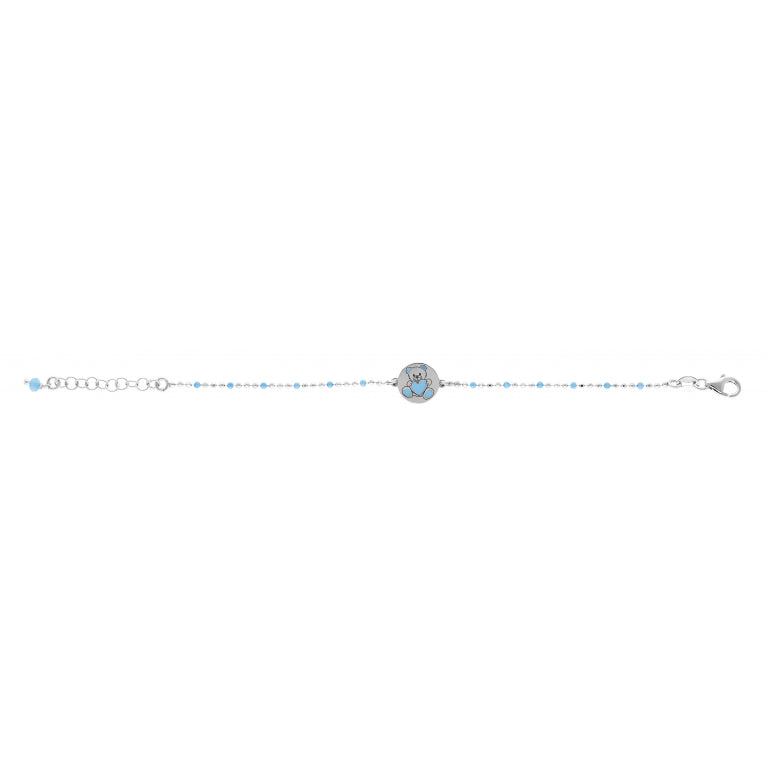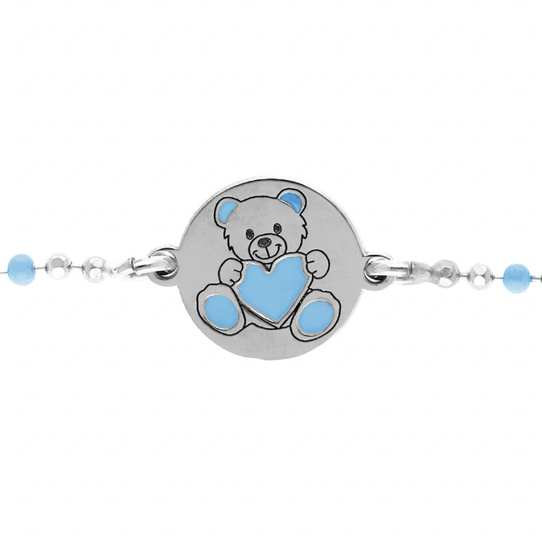 Ce bracelet délicat présente un médaillon rond orné d’un ourson tenant un cœur bleu, parfait pour une touche de douceur et de tendresse. Les petites perles bleues et argentées complètent élégamment ce bijou pensé pour les moments précieux.